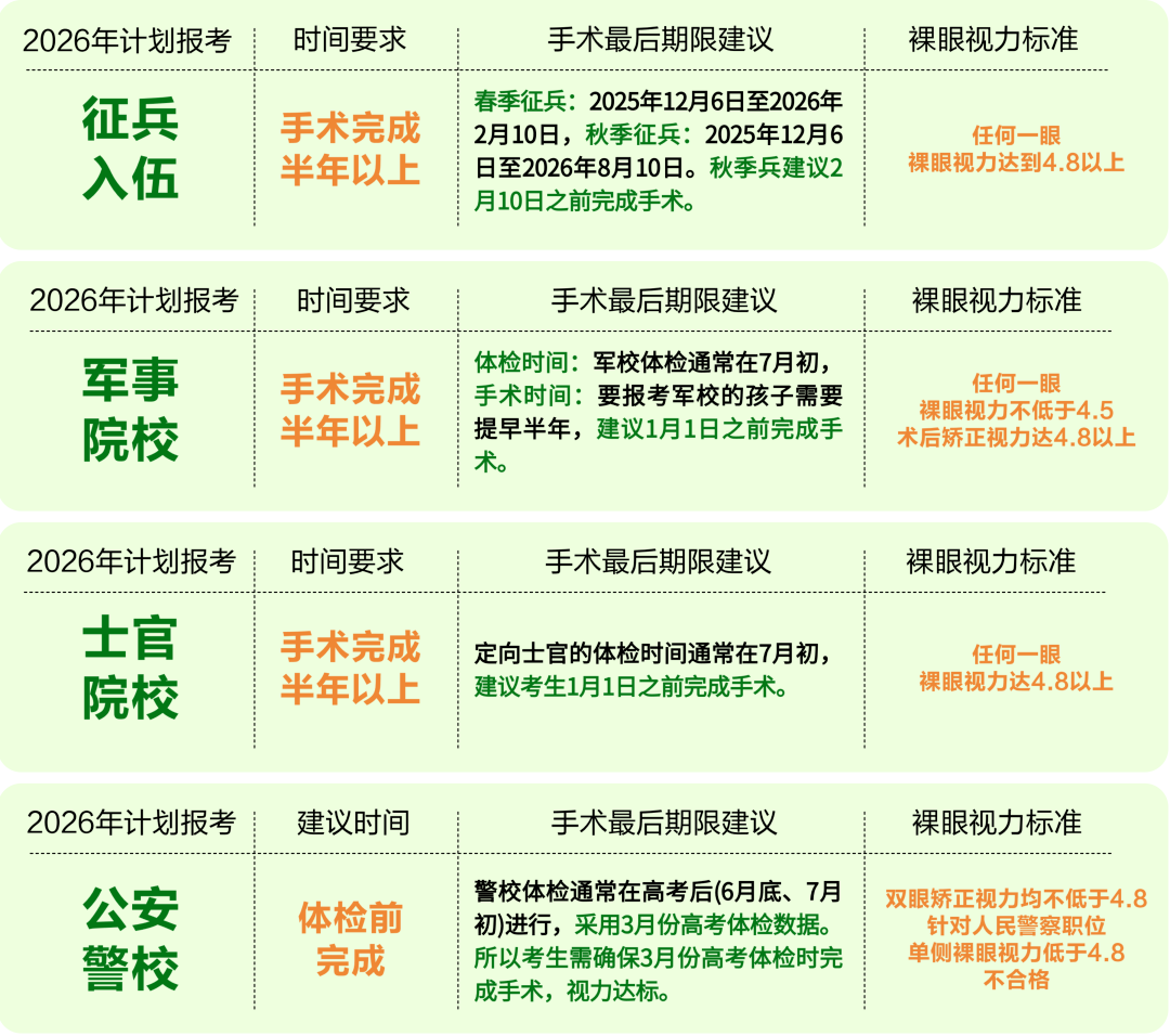 而对于计划参军入伍,或是报考军事类院校等对视力有明确要求的特殊专业的考生而言,近视手术的时间规划可谓是“体检关键一步”,它直接关系到能否顺利通过视力考核,实现投身军营的梦想。