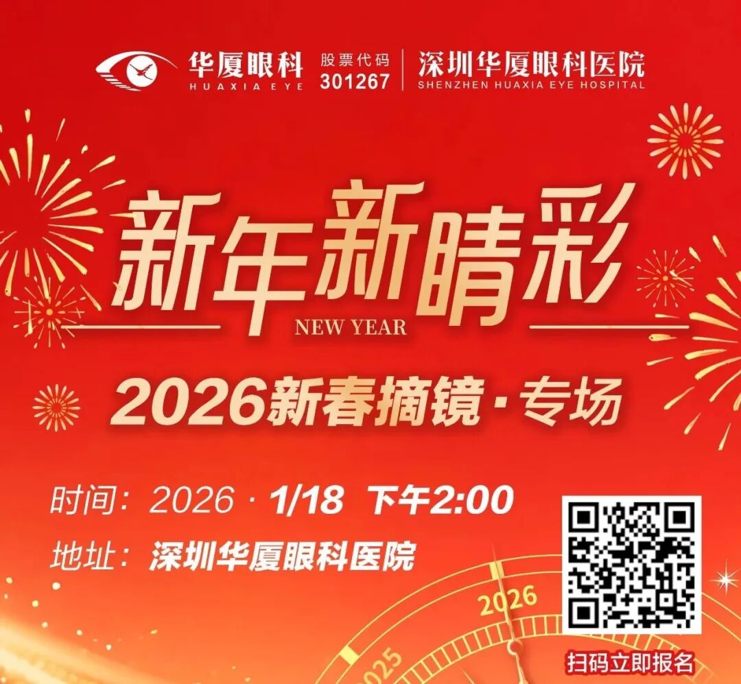 深圳华厦眼科医院将在1月18日下午2点举办新年新睛彩2026新春摘镜专场活动,新年新睛彩2026新春摘镜专场活动,报名参加活动可享免费术前基础检查,到场更有众多福利,有需要的朋友可以扫码报名。