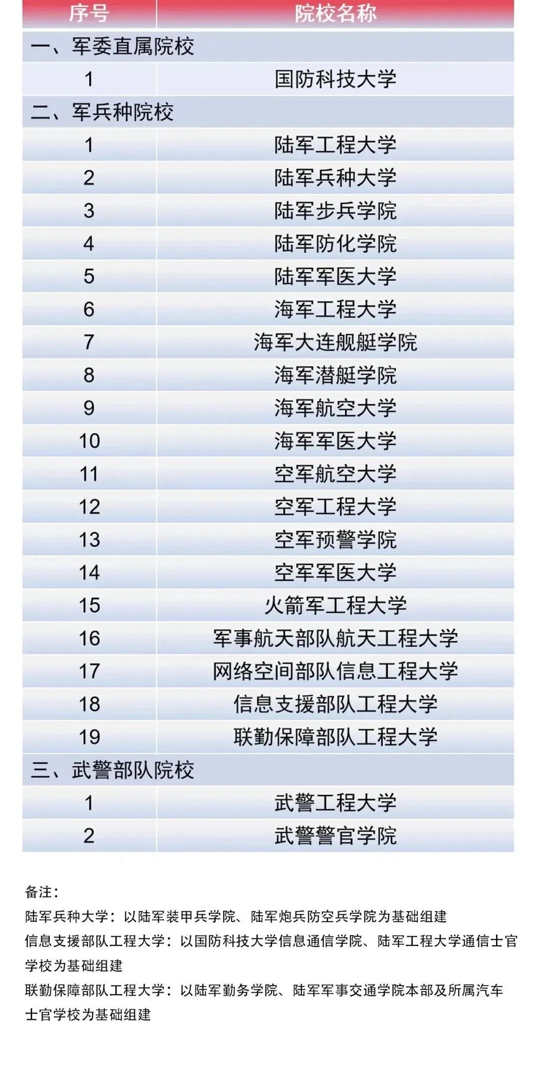 今年,共有22所军队高等教育院校面向普通高中毕业生招生。其中,军委直属院校1所,军兵种院校19所,武警部队院校2所。