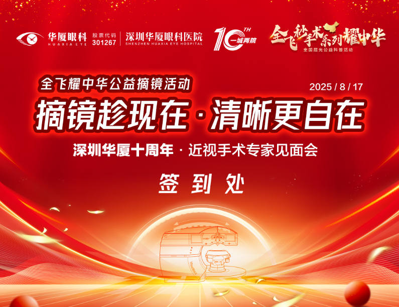 深圳华厦眼科医院将于8月17日下午2点在院内举办摘镜趁现在 清晰更自在——全飞耀中华公益摘镜活动。屈光科基础检查免费(提前了解自己的眼部健康状况,为摘镜做好准备。)深圳华厦眼科医院为不同需求的近视患者提供了多种摘镜手术方案:飞秒+蔡司导航TICL人工晶体植入术 41200元/双眼飞秒+蔡司导航ICL人工晶体植入术 37200元/双眼蔡司导航TICL人工晶体植入术 32200元/双眼蔡司微创全飞秒精准4.0-VISULYZE 19600元/双眼现场可获100-300互动手术代金券。(不可与抽奖券叠加使用)(注:二、三等奖在优惠价基础上减免,不予任何优惠叠加使用,不可转让他人。)现场缴纳全款可参与抽取红包代金券300-1000元,机会不容错过!(不可与抽奖券叠加使用)当月手术抽好礼(拉布布、充电宝、太阳伞、眼药水、墨镜、购物卡等各种好礼随机获得)